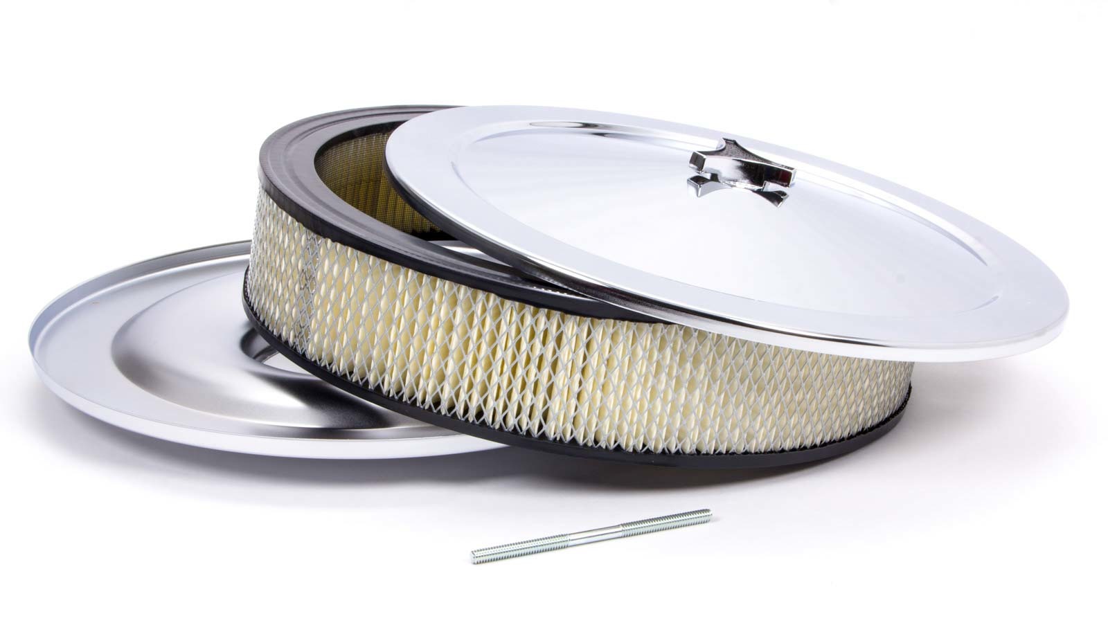 Product Description Air Cleaner Assembly - Muscle Car - 14 in Round - 3 in Element - 5-1/8 in Carb Flange - Flat Base - Steel - Chrome - Kit