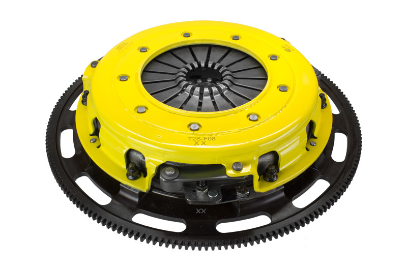 T2S-F08 street twin disc kit offers twice the number of disc surfaces for better wear, heat capacity and long life compared to single disc kits. These kits use a proprietary Positive Lift Floater System design, which results in quiet operation with no floater rattle and no posts to wear. ACT twin disc kits undergo an exclusive four-stage, heat treating process on all diaphragms. The ACT twin disc features the ability to adjust for disc wear and provides equal disengagement for discs. The ACT Performance street rigid-hub discs feature premium organic materials with high copper content for better heat transfer and steel-backed lining for greater burst strength and durability. The chrome-moly hub is heat-treated for strength and durability. Rivet design and materials are carefully selected for maximum strength. All ACT twin disc kits include a CNC-machined and dynamically balanced flywheel to ensure trouble-free installation and operation. ACT twin disc kits include a pressure plate, two discs, a floater, flywheel and alignment tool. Some kits may include a pilot bearing and release bearing.