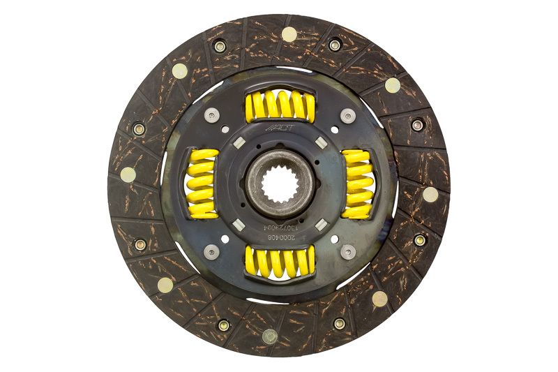 2000408 is a modified spring-centered street disc featuring premium organic friction material with high copper content for better heat transfer and steel-backed lining for greater burst strength and durability. These discs are modified with reduced marcel for faster shift action to complement ACT pressure plates. The heavy duty torsional dampening springs are stronger, in most cases, than standard springs and are provided in the best sizes and spring rates to suit the application. Modified street discs allow for quicker shifting and engagement. Quiet operation with increased strength and reliability.