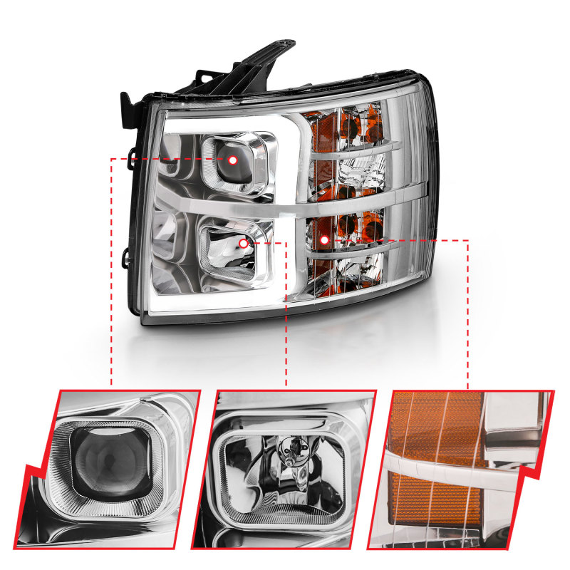 Projector Headlight Set, Clear Lens, Chrome Housing, Pair,. Guaranteed To Improve Your Vehicles Appearance. Rigorously Tested For Fit And Function. Simple Plug And Play. No Modifications Required. Easy Installation Using Common Hand Tools. Uses Stock Mounting Locations And Hardware. D.O.T. Compliant To S.A.E. Standards. Sold As A Pair.