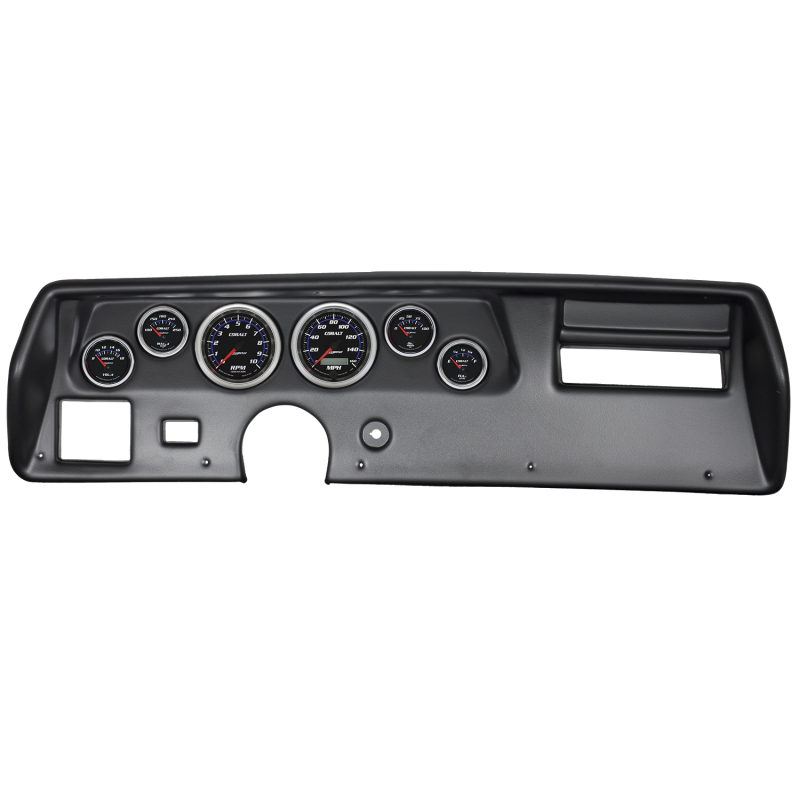Upgrade your muscle car or classic truck with an AutoMeter direct-fit Cobalt dash kit. Each easy-to-install package includes a durable replacement dash panel and six iconic Cobalt series gauges featuring spun metal dials and bright chrome bezels. White LED through dial lighting ensures optimal visibility during low-light conditions while our easy, no fab installation allows you to preserve the original interior of your classic ride.