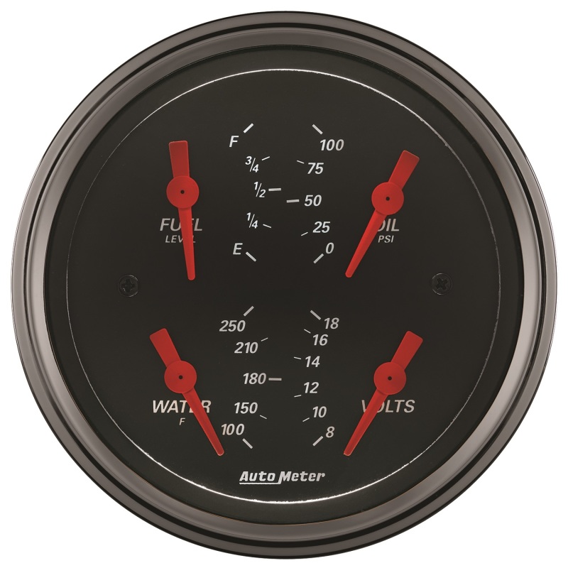 Sometimes space is limited. The AutoMeter Quad Gauge provides a solution to limited dashboard space while providing a clean look. Individual AutoMeter air core meter movements for each function provide the accuracy and durability required by even the most demanding applications. Includes a single wire 1/8? NPT temperature sender and a 1/8? NPT oil pressure sender. The voltmeter reads from 8-18v on negative ground electrical systems and fuel level resistance range is 0 ohms empty to 90 ohms full (compatible with Amid 60?s through mid 90?s GM fuel level senders).