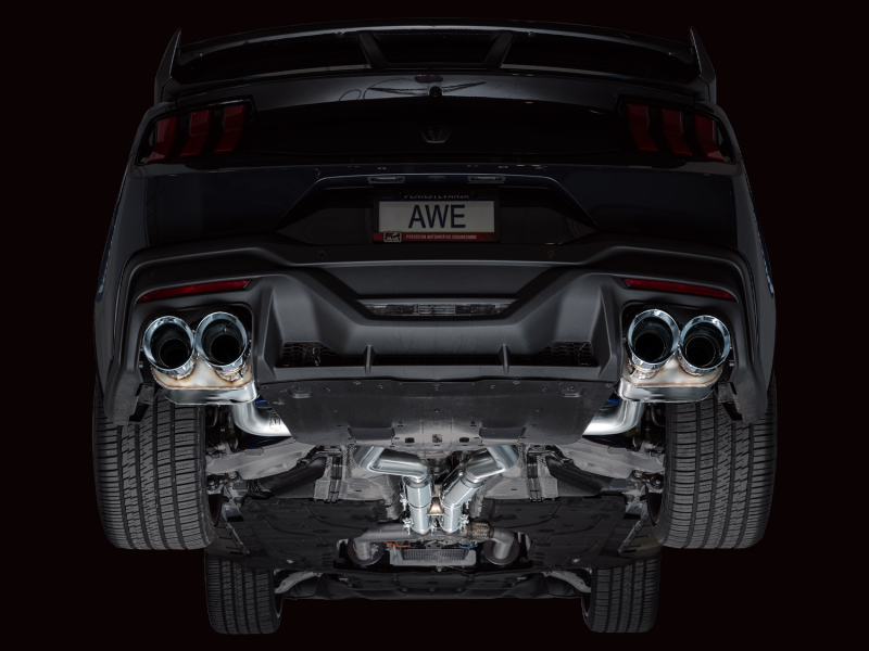 Introducing the AWE SwitchPath™ Cat Back Exhaust for the Ford S650 Mustang Dark Horse. This system retains all the customization of the factory active exhaust while unleashing the Dark Horse’s 5.0L engine with the push of a button or the drop of a hammer. Engineered for both sophistication and raw power, SwitchPath™ is valved for your comfort. It boasts a full 3” design with modular inlets, including slip fit adapters for seamless integration with factory headers and the option for a dual 3” connection for those seeking an even more aggressive setup. Thanks to tier-1 valving, drive modes, customized settings, and programmable buttons respond promptly to your commands. The precision H-pipe ensures a deep, rich muscle tone with minimal rasp, unlike an X-pipe. Additionally, straight-through bullet-style resonators in the mid pipes further minimize rasp, catering to drivers considering header upgrades. On the performance front, dyno-verified gains of +8 hp and +8 lb-ft of torque at the wheels. AWE's SwitchPath™ Cat Back is 100% emission-friendly, seamlessly integrating with factory emissions equipment. Completing the package are quad 5” slash-cut, double-walled tips, available in chrome silver or diamond black. Crafted in PA, USA, from US-sourced .065”-wall T304L stainless steel, every aspect is engineered, designed, and manufactured in-house at AWE. Backed by AWE's Lifetime Warranty, No CEL Light Guarantee, and Perfect Fitment Guarantee.