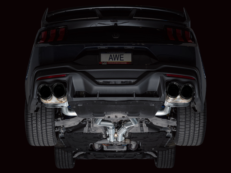 Introducing the AWE SwitchPath™ Cat Back Exhaust for the Ford S650 Mustang Dark Horse. This system retains all the customization of the factory active exhaust while unleashing the Dark Horse’s 5.0L engine with the push of a button or the drop of a hammer. Engineered for both sophistication and raw power, SwitchPath™ is valved for your comfort. It boasts a full 3” design with modular inlets, including slip fit adapters for seamless integration with factory headers and the option for a dual 3” connection for those seeking an even more aggressive setup. Thanks to tier-1 valving, drive modes, customized settings, and programmable buttons respond promptly to your commands. The precision H-pipe ensures a deep, rich muscle tone with minimal rasp, unlike an X-pipe. Additionally, straight-through bullet-style resonators in the mid pipes further minimize rasp, catering to drivers considering header upgrades. On the performance front, dyno-verified gains of +8 hp and +8 lb-ft of torque at the wheels. AWE's SwitchPath™ Cat Back is 100% emission-friendly, seamlessly integrating with factory emissions equipment. Completing the package are quad 5” slash-cut, double-walled tips, available in chrome silver or diamond black. Crafted in PA, USA, from US-sourced .065”-wall T304L stainless steel, every aspect is engineered, designed, and manufactured in-house at AWE. Backed by AWE's Lifetime Warranty, No CEL Light Guarantee, and Perfect Fitment Guarantee.