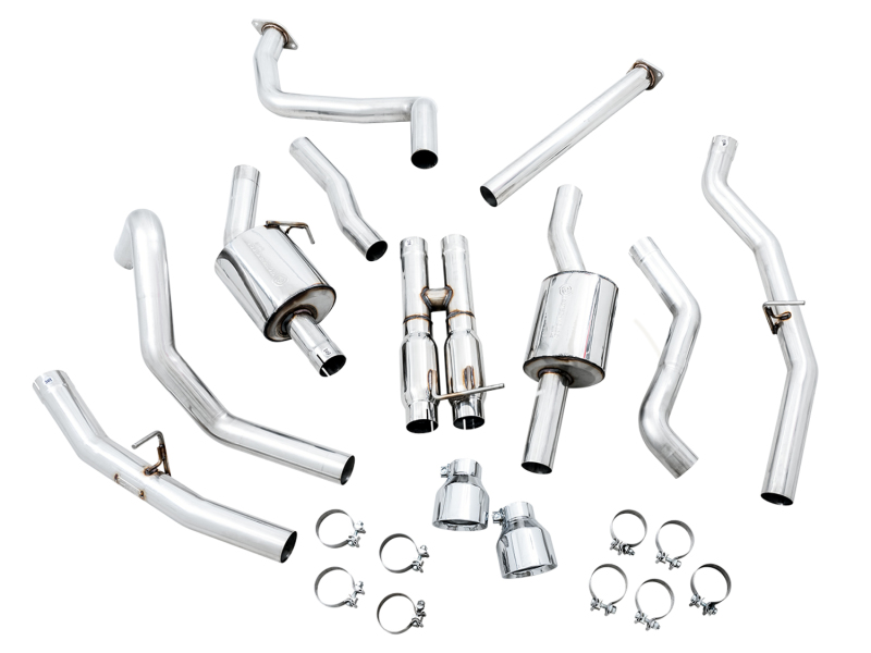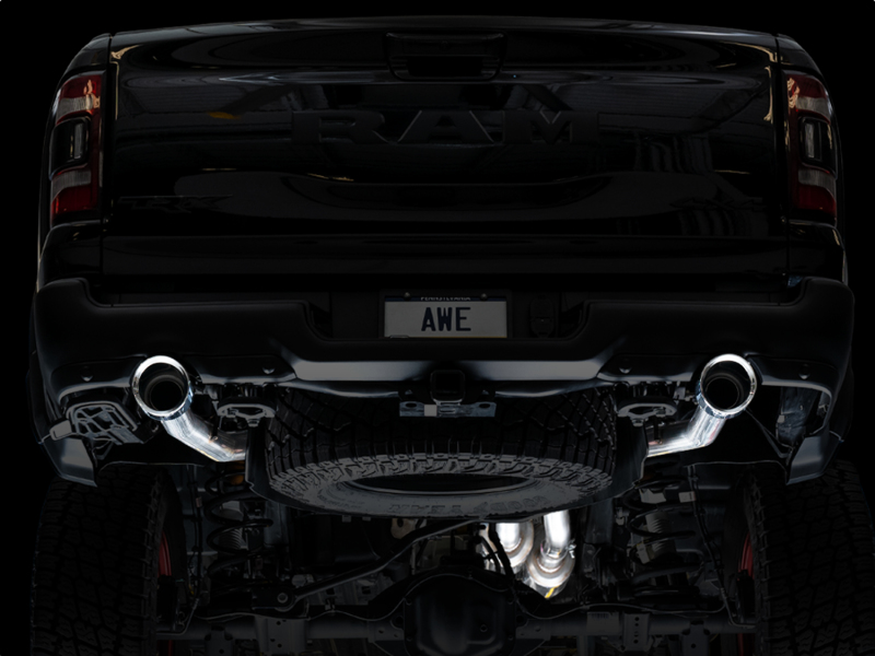 The 0FG is a dual 3” T304L stainless steel Cat Back configuration featuring a bespoke resonated H-pipe and AWE’s patented drone-canceling 180 Technology®. Together, combined with precision fitment, class-leading rigidity, and signature 5” slash-cut tips, you're looking at the Best Sounding Exhaust on the Planet™ for the RAM TRX. American-sourced T304L stainless steel with a wall thickness of .065” runs smoothly from front to back, connecting right after the factory emissions equipment. A resonated H-pipe tailored specifically for the 6.2L-packed TRX is met shortly after to provide an aggressive and rich muscle tone with minimal rasp. You're looking at the Chrome Silver tips version of the exhaust, featuring aggressive 5”, double-walled slash-cut tips, and stamped AWE logos to let everyone know what team you're on. The TRX system by AWE is one of the most significant upgrades available for your TRX. Let's rumble.