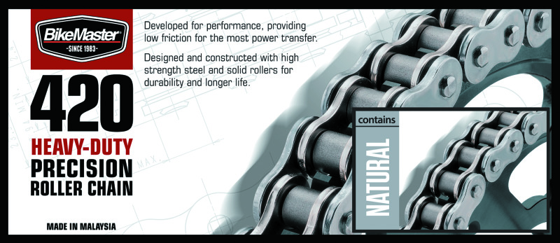 Developed for performance, providing low friction for the most power transfer. Designed and constructed with high-strength steel and solid rollers for durability and longer life. Note: This chain must be correctly matched to the machine size and power output. Failure to do so could result in chain failure, causing machine or property damage, serious injury or death. It is the responsibility of the installer to ensure that the chain selected is correctly matched to the machine and installed correctly. If you have any doubts, contact a professional before use.