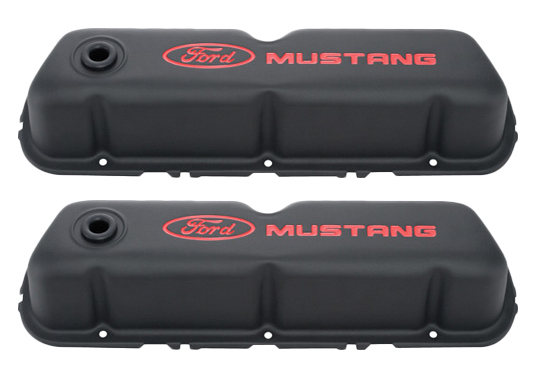 Product Description Valve Cover - Tall - Baffled - Breather Hole - Ford Mustang Logo - Steel - Black Crinkle - Small Block Ford - Pair