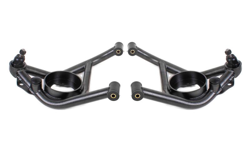 A-arms are one of the most important, yet overlooked suspension components. They are the direct link between the front wheels and the chassis. Any deflection causes a change in alignment, which results in poor performance and driving feel. Fabricated from heavy-duty 1.500-inch, 0.095-inch wall and 1.525-inch, 0.095-inch wall DOM tubing with laser-cut, CNC-formed plate steel braces for extra strength, deflection is eliminated with A-arms from BMR Suspension. BMR(TM) s AAL321 Lower A-arms are fitted with heavy-duty ball joints and greaseable, Delrin bushings add a solid, more responsive feel over the stock rubber bushings. BMR(TM) s bushings are internally fluted, which allows grease to evenly coat the inner sleeve. These flutes also direct grease to the outer edge of the bushing, keeping the thrust surface lubricated. This efficient lubrication ensures reliable operation over the life of the bushings.BMR(TM) s AAL321 Lower A-arms eliminate A-arm deflection, greatly improving steering feel and response in normal and performance driving situations. The Delrin bushings add strength and eliminate deflection compared to stock rubber bushings. The tubular design gives you tons of added strength and a significant reduction in weight over the stock arms. The means you get a great blend of performance and comfort. Designed for street performance, drag race, and road course applications.BMR Suspension AAL321 Non-Adjustable Lower A-arms are available in black hammertone and red powdercoat for long-lasting good looks. Installation time is 3-4 hours. Proudly made in the U.S.A.