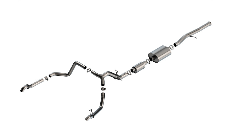This system features the classic BORLA(r) S-Type sound level and turn down tailpipes. It was designed specifically for the Silverado 1500 ZR2 and Sierra 1500 AT4X and delivers great sound without any drone. Replace the small muffler behind the primary muffler in the BORLA(r) "S-Type" system with Polyphonic Harmonizer 60680 to attain the "ATAK(r)" sound level (louder than "S-Type"). Optional "True Dual" Cat-Back(r) system available, see the Related Parts section. BORLA(r) Cat-Back(tm) & Axle-Back exhaust systems feature patented straight-through and multi-core technology to unleash hidden horsepower. Increased exhaust velocity adds power, driving excitement, fuel economy, and the distinctive BORLA(r) Sound of Power respected by motoring enthusiasts everywhere. Each system is built from premium T-304 austenitic stainless steel, superior to T-400 series knockoffs (such as 409), to give you the absolute best in performance and durability. Ultra-smooth mandrel bends ensure maximum flow & power, and precision computer numerical control (CNC) manufacturing ensures an accurate fit. Best of all, BORLA(r) stands behind every system with a Million-Mile Warranty. Just what you'd expect from the world's most experienced (and most winning) exhaust brand.