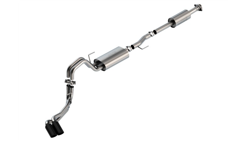 EXCEPT 3.5L V6 PowerBoost, Raptor, Tremor, and Black Appearance Package. The BORLA Cat-Back system 140870BC was specifically designed to enhance the power and sound of the Ford F-150 equipped with 2.7L and 3.5L Engines. It includes 4" black chrome on T-304 stainless steel tips and a dual side exit configuration. Using BORLA Stainless Steel Polish p# 21461 is NOT recommended with these black chrome tips. We suggest cleaning the tips with hot water and a microfiber cloth. The entire system is made of T-304 stainless steel and utilizes computer numerical control (CNC) manufacturing techniques that ensure an accurate fit. This system features the Touring sound level that gives you a mild sound of power with no drone. It is also available with bright chromed tips (part number 140870). There are also systems available for the 2.7L and 3.5L F-150 that offer different options for sound level, tip finish and tip Exits. Add Adapter 60556 for Crew Cab with Standard Bed (6' 7") 157.2" Wheelbase vehicles. Add Adapter 60564 for Extended Cab with Long Bed (8' 2") 164.1" Wheelbase vehicles. All this is backed by our unsurpassed Million Mile Warranty.System Features: Cat-Back System Dual Side Exit 4" Black Chrome On T-304 Stainless Steel Tips Touring Sound Level T-304 Stainless Steel Construction Bolt-On Installation Million Mile Warranty