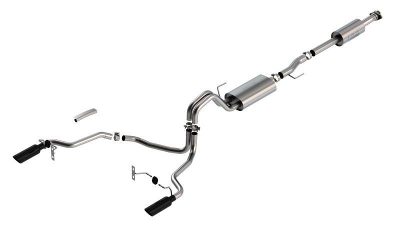 The BORLA Cat-Back system 140879BC was specifically designed to enhance the power and sound of the Ford F-150 equipped with 3.3L engine. It includes 4" black chrome on T-304 stainless steel tips and a split rear exit configuration. Using BORLA Stainless Steel Polish p# 21461 is NOT recommended with these black chrome tips. We suggest cleaning the tips with hot water and a microfiber cloth. The entire system is made of T-304 stainless steel and utilizes computer numerical control (CNC) manufacturing techniques that ensure an accurate fit. This system features the ATAK sound level that gives you our most aggressive sound level with no drone. It is also available with bright chromed tips (part number 140879). There are also systems available for the 3.3L F-150 that offer different options for sound level, tip finish and tip exits. Add adapter 60556 for Crew Cab with Standard Bed (6' 7") 157.2" Wheelbase vehicles. Add adapter 60564 for Extended Cab with Long Bed (8' 2") 164.1" Wheelbase vehicles. All this is backed by our unsurpassed Million Mile Warranty.System Features: Cat-Back System Split Rear Exit 4" Black Chrome On T-304 Stainless Steel Tips ATAK Sound Level T-304 Stainless Steel Construction Bolt-On Installation Million Mile Warranty