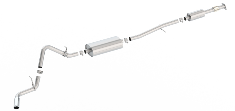 Factory Single Side Exit vehicles ONLY. The 140800 Cat-Back(tm) system will give your 2.7L Silverado and Sierra the right sound and performance without any of the annoying drone often found in four cylinder applications. The Borla(r) S-Type Cat-Back(tm) system is tuned for flow and sound on the turbo four cylinder engine of the GM 1500 trucks. This system features a 4" bright chrome on T-304 stainless steel tip. A black chrome on T-304 stainless steel tip is also available. Add Adapter 60708 For Crew Cab with Standard Bed (6' 7") 157" Wheelbase vehicles. Ultra-smooth mandrel bends ensure maximum flow & power, and precision computer numerical control (CNC) manufacturing ensures an accurate fit. The system is constructed using premium, high quality T-304 stainless steel which is superior to 400 series and is backed by the Borla(r) Million Mile Warranty.