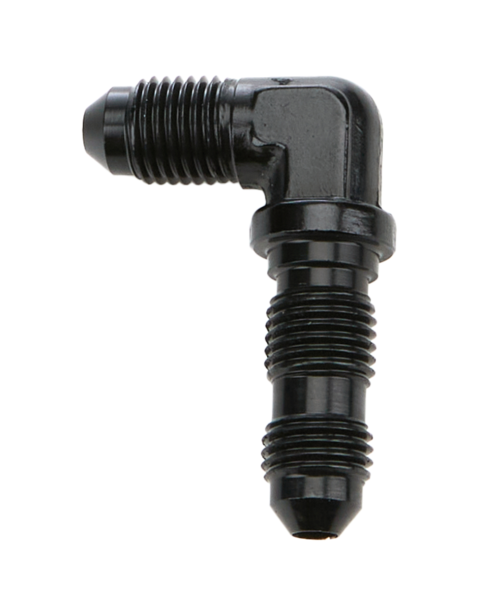 Product Description Fitting - Bulkhead - 90 Degree - 4 AN Male to 4 AN Male Bulkhead - Aluminum - Black Anodized - Each