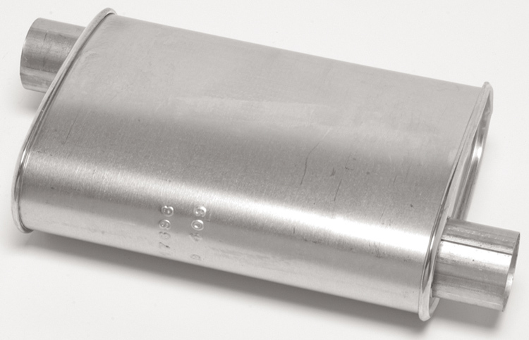 Product Description Muffler - Thrush Turbo - 2.5 in Offset Inlet - 2.5 in Offset Outlet - 14 x 4.25 x 9.75 in Oval Body - 18.5 in Long - Steel - Aluminized - Universal - Each