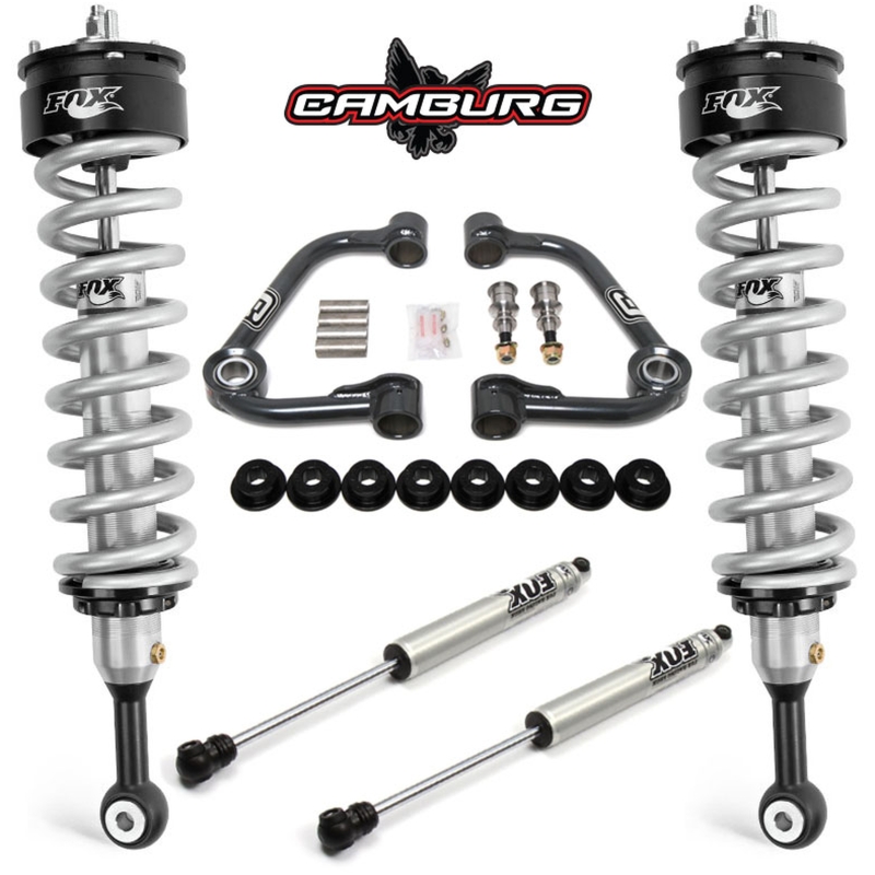 The Camburg FOX 2.0 Trail Series kit is a suspension system designed for the Ford F-150. It includes FOX 2.0 Performance Series IFP Coilovers that provide 0-2 inches of lift and increased wheel travel. These shocks feature a durable alloy body, billet aluminum components, and a heat-treated alloy steel shaft. The kit also includes uniball upper arms that replace the stock ball-joint, improving wheel travel and durability. The arms have increased caster and a modified camber curve for better alignment and handling. A billet aluminum cover protects the uniball from dirt and contaminants. In the rear, the kit includes FOX 2.0 Performance Series shocks with a larger shock body for improved off-road performance. Note that factory 20" wheels may require a spacer and aftermarket wheels with the correct offset are recommended for optimal fit and performance. This kit is not compatible with vehicles equipped with certain features such as Continuously Controlled Damping (CCD) adaptive suspension, BlueCruise or PowerBoost Hybrid engines, or Tremor models. The kit provides a 0-2" lift, improved ride and handling, and is made in the USA.