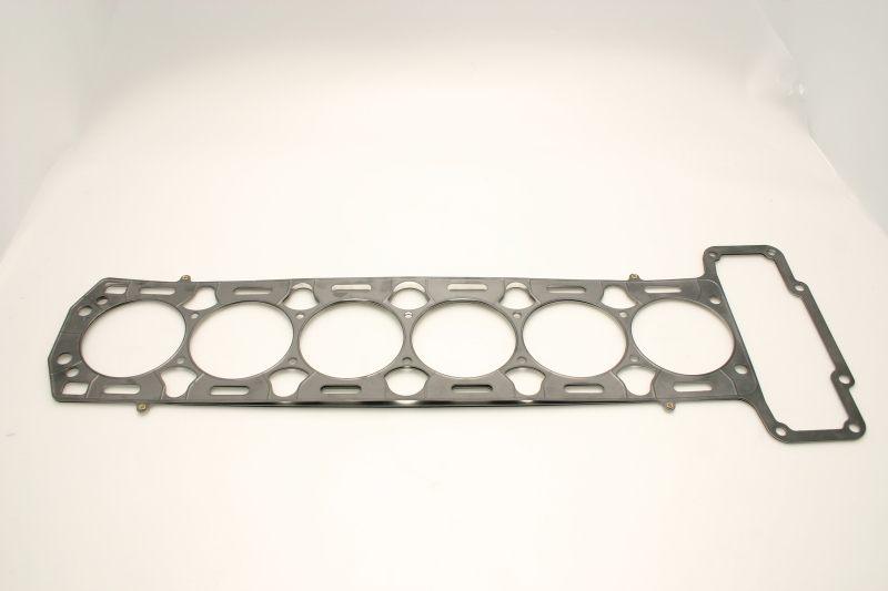 Comprised of multiple embossed layers of stainless steel with the outer layers utilizing a Viton rubber coating. Compressed thickness is 0.098". With Bolt Hole pockets. Cometic MLS (Multi-Layer Steel) Head Gaskets provide maximum sealing performance for todays high output engines and require no sealants. MLS gaskets are ideal for both aluminum heads to aluminum blocks and aluminum heads to cast iron blocks. They can withstand the shearing force created by the two materials. MLS gaskets have increased strength because they are comprised of multiple layers of stainless steel; which also creates the ability to rebound and resist corrosion. The outer layers are embossed and coated on both sides with Viton (a flour elastomer rubber based material that is heat resistant to 250 C/ 482 F). Viton is designed to meet the demands of a variety of harsh sealing environments, load conditions, and surface finishes. The center or shim layer is uncoated stainless steel, which can be varied to accommodate multiple thickness requirements.