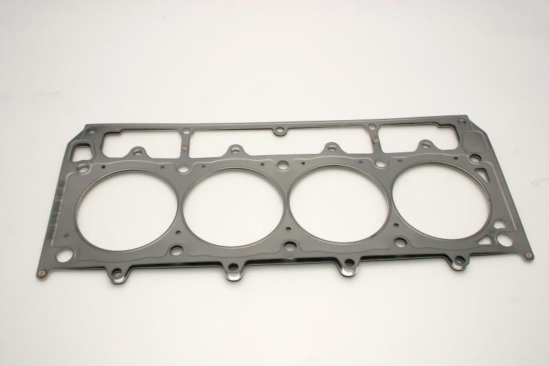 Comprised of multiple embossed layers of stainless steel with the outer layers utilizing a Viton rubber coating. Compressed operating thickness is 0.098". 18 Bolt Heads. Right Side. Cometic MLS (Multi-Layer Steel) Head Gaskets provide maximum sealing performance for todays high output engines and require no sealants. MLS gaskets are ideal for both aluminum heads to aluminum blocks and aluminum heads to cast iron blocks. They can withstand the shearing force created by the two materials. MLS gaskets have increased strength because they are comprised of multiple layers of stainless steel; which also creates the ability to rebound and resist corrosion. The outer layers are embossed and coated on both sides with Viton (a flour elastomer rubber based material that is heat resistant to 250 C/ 482 F). Viton is designed to meet the demands of a variety of harsh sealing environments, load conditions, and surface finishes. The center or shim layer is uncoated stainless steel, which can be varied to accommodate multiple thickness requirements.