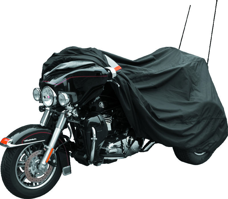Heavy-duty, top of the line, all-weather cover from CoverMax® by BikeMaster® that is designed specifically for trikes. Waterproof seams, 300-denier polyester with PU coating. Ultra-soft 30g velour lining helps protect paint from scratches. Two top covered vents improve ventilation and help reduce condensation build up. Vent covers are reflective for added visibility and security. Convenient access panel without removal of cover. Windshield liner helps protect windscreen from scratching. Extra-wide tail slot accommodates multiple radio antennas. Tailor-fit elastic skirt and adjustable hook-and-loop center strap helps secure the cover and gives a custom style fit. Built-in grommets for use of security cable lock (cable lock not included). Available for metric or Harley-Davidson® trikes and/or Spyder roadster.