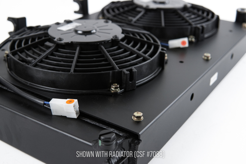 While the OEM Fans are functional, they are still a design dating back to the 1980's and leave plenty of room for improvement. Electric fan technology has progressed a lot over the years and newer fans can efficiently move more air with a lower drawn on your car's electrical system. The laser cut shroud ensures the most efficient function of the fans drawing air through the radiator. The low profile dual 9-inch SPAL fans move 1180 CFM of air. The Fan & Shroud kit is designed to fit the CSF #7088 Radiator but will also fit OEM 944 NA Radiators. These fans have standard SPAL connectors but can be rewired for OEM connectors during installation.