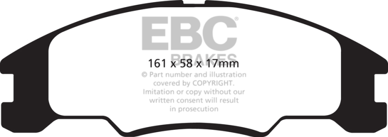 Designed for premium street driving offering better brake effect up to 600-degrees C (1100-degrees F). EBC Greenstuff has a high initial brake effect and gives drivers confidence from first application of the brake pedal. There is no such thing as a NO DUST pad. The very nature of how a brake works requires that some dust be generated to avoid rotor vibration (shimmying). The EBC pad creates less dust and dust is more easily washed off than most. All pads create more dust as they are bedding in especially if rotors are worn. Nominal friction coefficient 0.55. For heavier faster cars and vehicles above 200bhp we strongly recommend Redstuff which DOES offer much less dust.