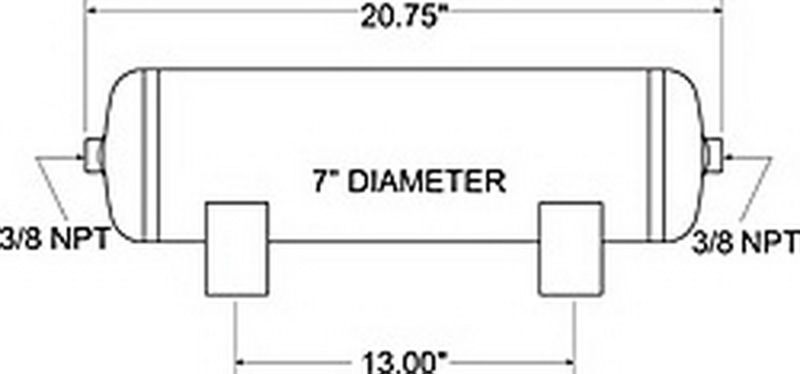 This Firestone air tank provides a source of compressed air for an air spring system. Tank has 3-gallon capacity and (2) 3/8 in. NPT ports. Tank is enamel coated to resist corrosion, tested to be SAE J10 compliant and capable of 150 psi. Features: Provides compressed air source for an air helper spring system Allows for faster inflation of air springs Holds 3 gallons of compressed air Includes (2) 3/8 in. NPT ports Steel tank with brass fittings Resists corrosion with internal and external enamel coating Is SAE J10 compliant Operates at up to 150 psi of maximum pressure Specs: Tank dimensions: 20.75 in. long x 7 in. diameter Tank capacity: 3 gallons Inflation ports: 3/8 in. NPT PSI: Maximum of 150 2-Year limited warranty