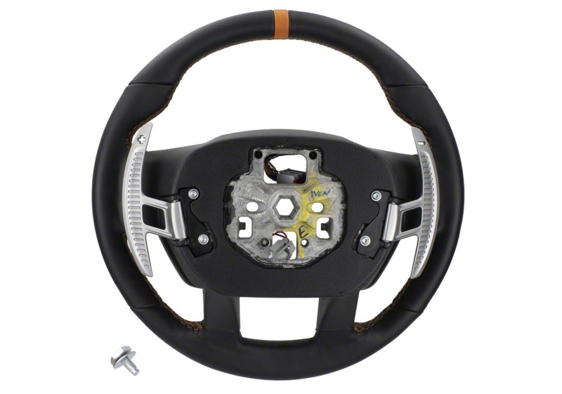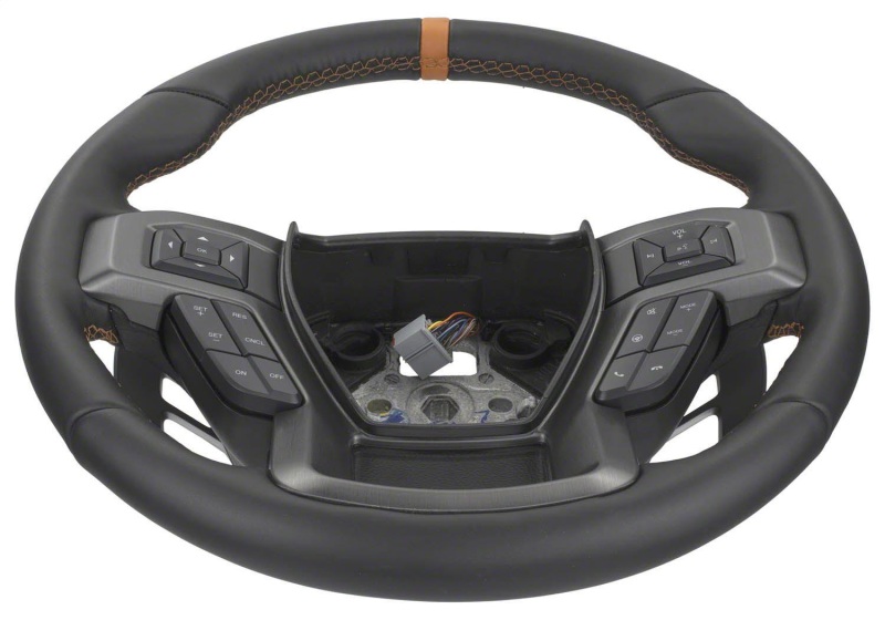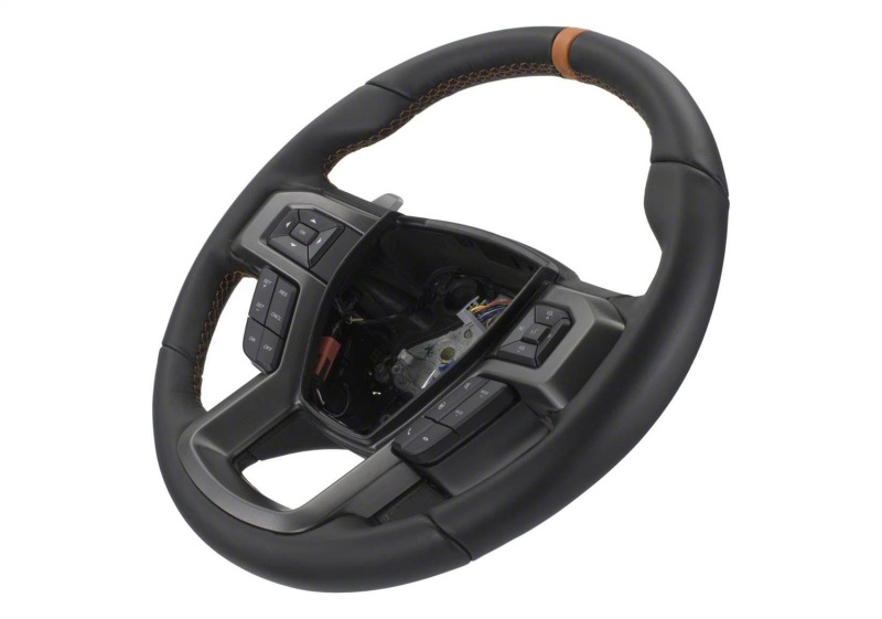 Black leather construction with perforated sides, grey stitching and a orange leather sightline. The Raptor steering wheel has a more aggressive look and a defined feel then F-150 steering wheels. Steering wheel comes equipped with a wire harness, trim bezel and Raptor steering wheel control controls. Installation into a non-Raptor F-150 and Raptors equipped with the Technology Package (68R) requires the steering wheel controls to be swapped from the original steering wheel. Kit includes a 2017 Raptor orange sightline heated steering wheel and all needed installation hardware.