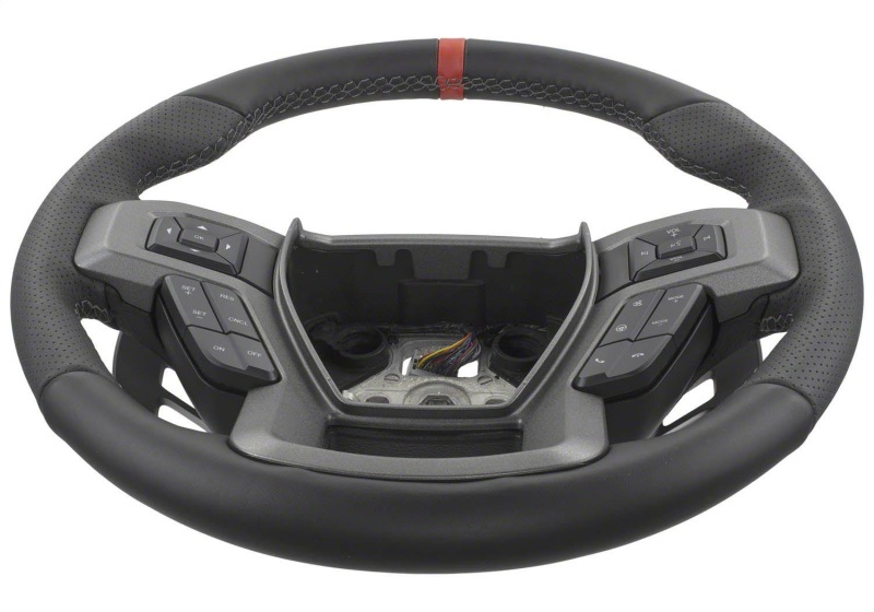 Black leather construction with perforated sides, grey stitching and a red leather sightline. The Raptor steering wheel has a more aggressive look and a defined feel then F-150 steering wheels. Steering wheel comes equipped with a wire harness, trim bezel and Raptor steering wheel control controls. Installation into a non-Raptor F-150 and Raptors equipped with the Technology Package (68R) requires the steering wheel controls to be swapped from the original steering wheel. Kit includes a 2017 Raptor red sightline heated steering wheel and all needed installation hardware.