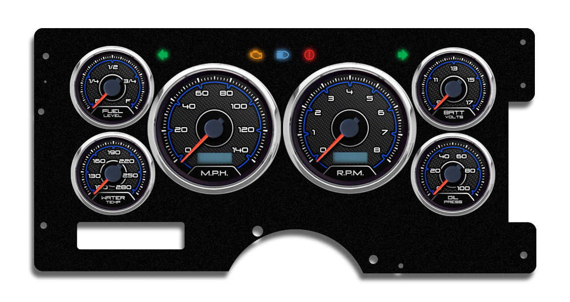 Product Description Gauge Kit - CFR Blue - Analog - Fuel Level / Oil Pressure / Water Temperature / Voltmeter / Tachometer / Speedometer - Black / Blue Face - GM Fullsize Truck 1988-94 - Kit
