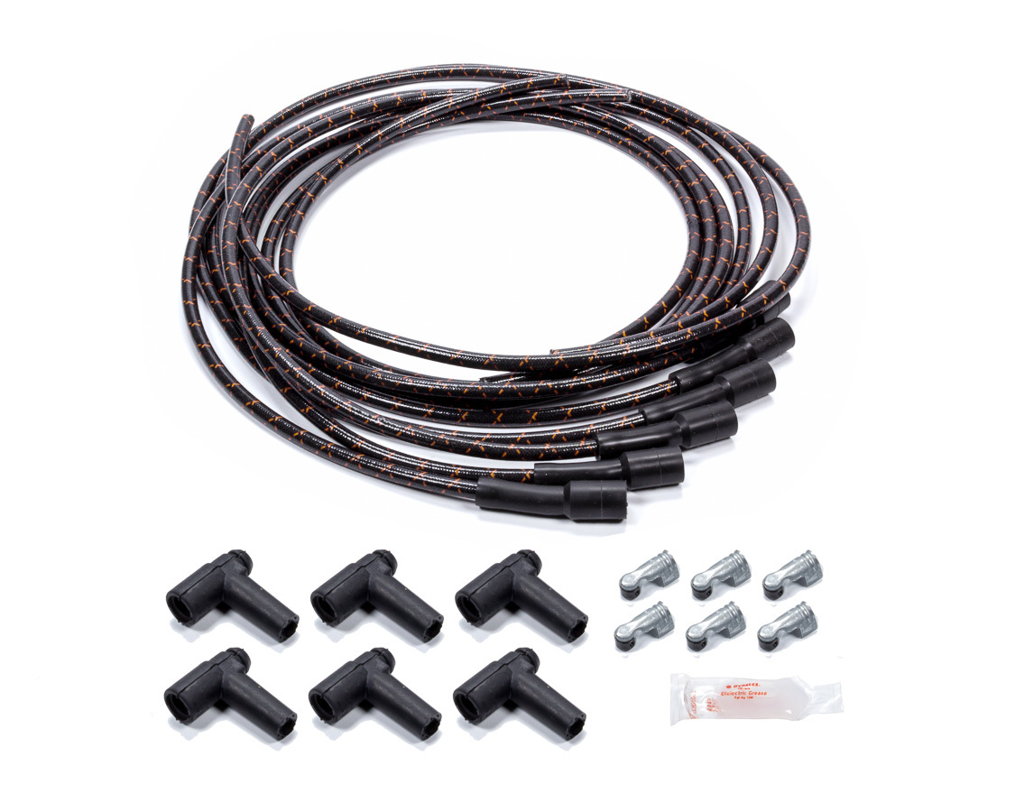 Product Description Spark Plug Wire Set - Spiral Core - 7.8 mm - Lacquer Covered Cotton Braid - Black / Orange - Straight Boots - HEI Style Terminal - Universal - Kit