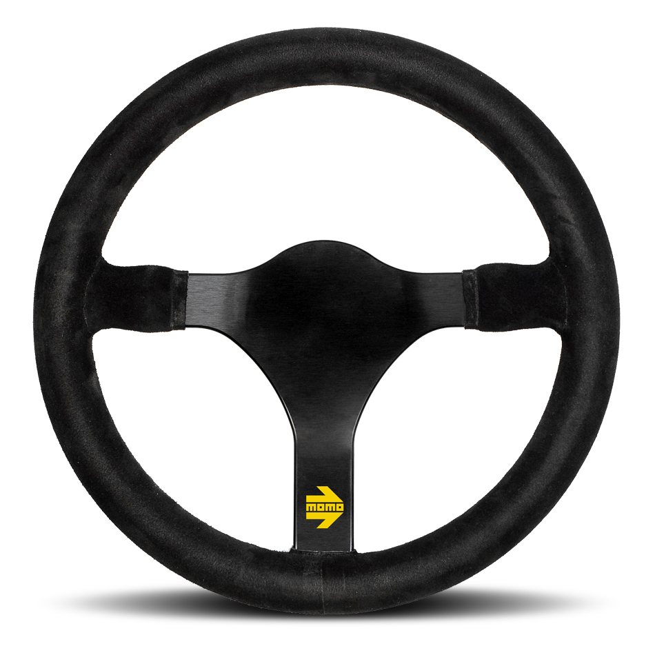 Product Description Steering Wheel - MOD. 31 - 320 mm Diameter - Flat - 3-Spoke - Black Suede Grip - Aluminum - Black Anodized - Each
