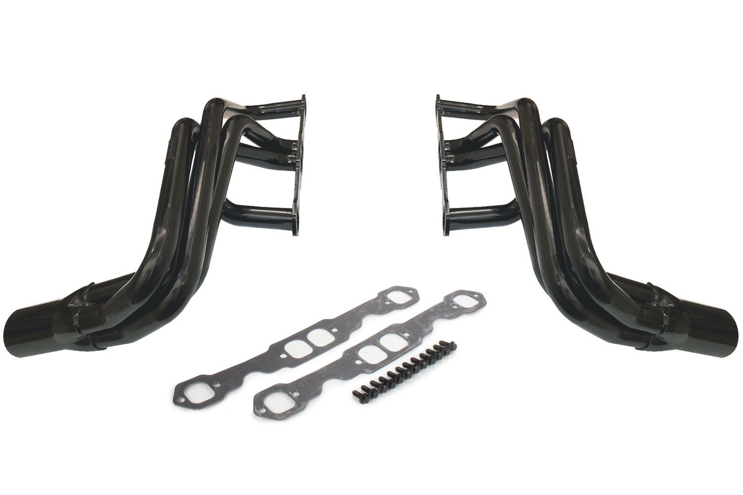 Product Description Headers - IMCA-UMP Stock Car - 1.75 in Primary - 3 in Collector - S-10 Forward Exit - Gaskets / Hardware Included - Steel - Black Paint - Small Block Chevy - Pair