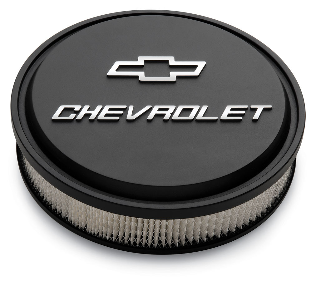 Product Description Air Cleaner Assembly - Slant Edge - 14 in Round - 3 in Element - 5-1/8 in Carb Flange - Dropped Base - Chevy Bowtie Logo - Aluminum - Black Crinkle Powder Coat - Kit