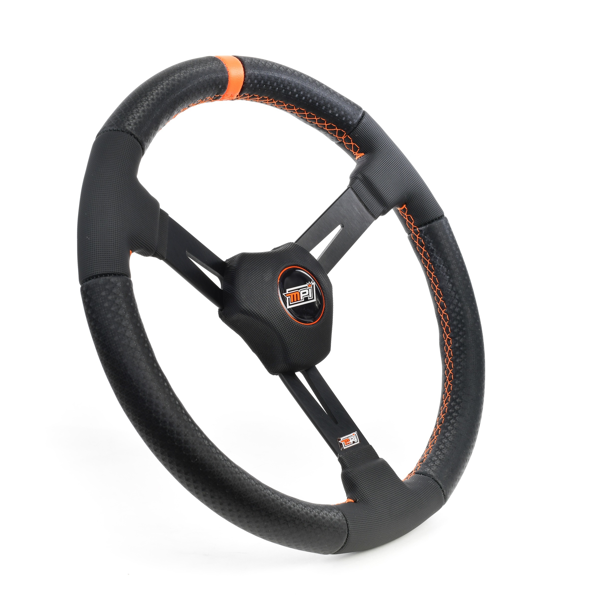 Product Description Steering Wheel - Dirt Circle Track - 15 in Diameter - 2.25 in Dish - 3-Spoke - Black Vinyl Grip - Orange Stripe - Aluminum - Black Anodized - Each