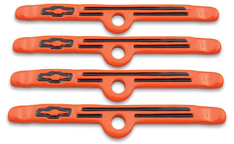 Product Description Valve Cover Hold Down Tabs - Chevy Bowtie Logo - Steel - Orange Paint - Small Block Chevy / V6 - Set of 4
