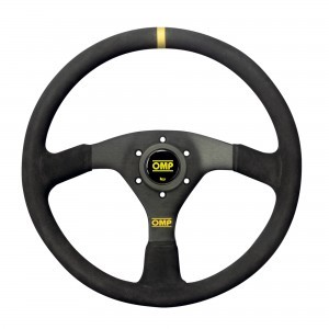 Product Description Steering Wheel - Velocita - 350 mm Diameter - Flat - 3-Spoke - Black Suede Grip - Yellow Stripe - Aluminum - Black Anodized - Each