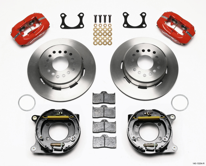 This group of FDL Pro-Series rear disc kits provides a complete solution for popular muscle car rear axles that require a parking brake. Forged billet Dynalite four piston calipers, 12.19" one-piece drum/rotors, and high friction pads provide optimized and balanced braking for all types of custom performance street/strip and show machines. The neatly hidden internal shoe system provides a clean installation with superior static holding power for parking. Optional caliper finishes and rotor designs enable the builder to personalize the style and optimize brake performance for every individual application.