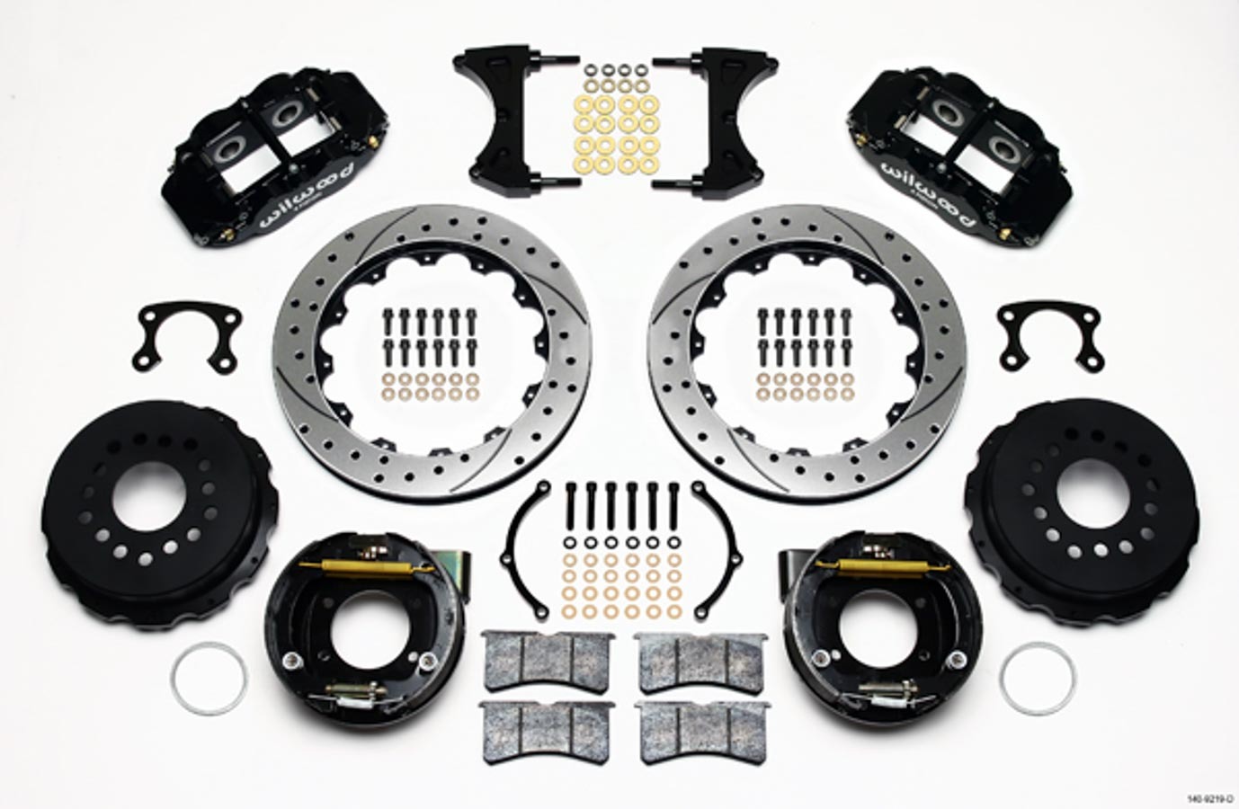 Product Description Specifications Brake System - 4R - Front - 4 Piston Caliper - 12.875 in Drilled / Slotted Iron Rotor - Offset - Aluminum - Black Powder Coat - Big Ford New Style - Kit MPN: 140-9219-D Clearance Item: N