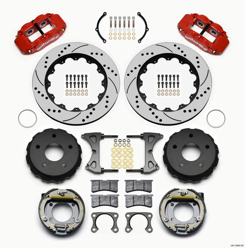 These versions of Forged Narrow Superlite 4R rear disc kits provide the ultimate Big Brake solution for Bronco 76-77 rear axles with Big Ford New Style flange and bearing. (normally: OE 11 inch diameter brakes and 3300 GVW.) Each includes a high efficiency drum style parking brake assembly. FNSL4R four piston calipers, 13" or 14" two-piece rotors, and high performance BP-10 compound pads provide optimized and balanced braking to compliment front big brake upgrades available for Bronco platform. The neatly hidden internal shoe system provides a clean installation with superior static holding power for parking. Optional caliper finishes and rotor designs allow builders to personalize the style and performance for every application.